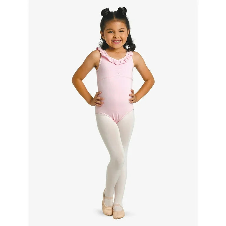 All the cute details your little one will love. Leotard features tank straps with ruffle trim, v-front with ruffle trim, a pinched front, elongating empire seaming, and a strappy back. Leotard is fully front lined.